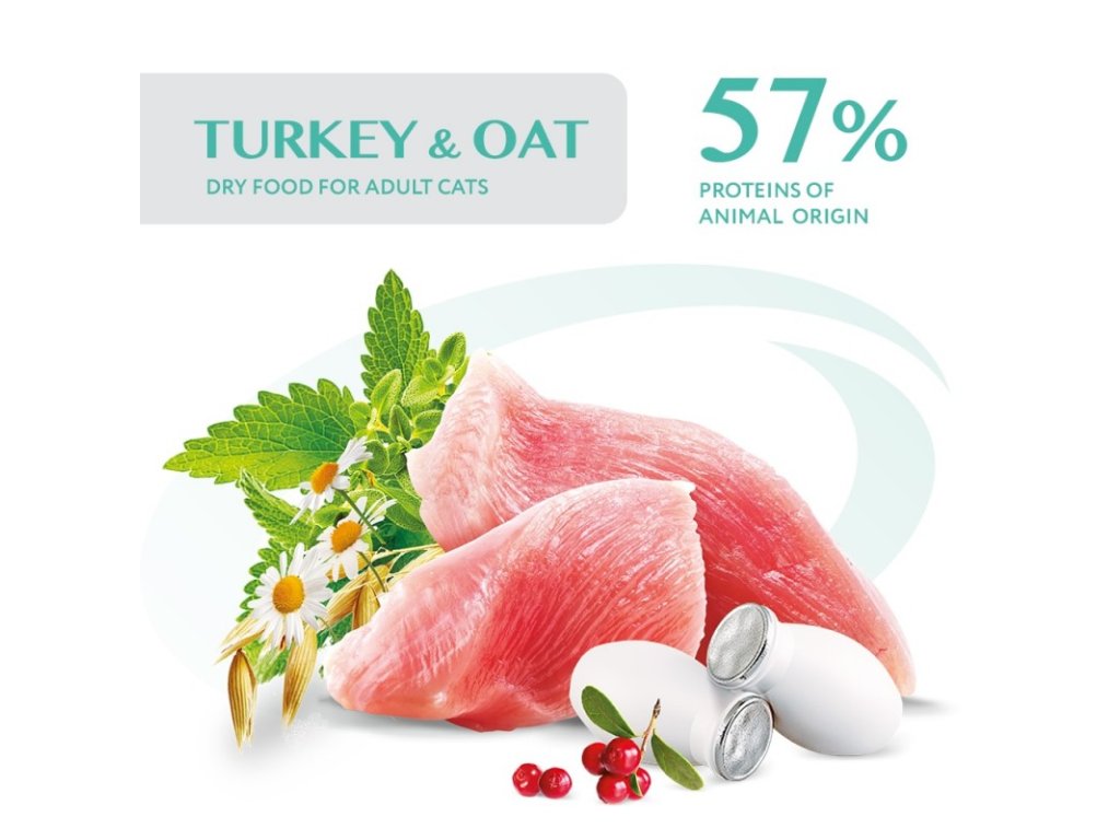dehydrované morčacie bielkoviny, nie menej ako 25 %, kukuričný lepok, ryža, kukurica, lúpaný ovos 5,46 %, hydinový tuk, morčacie mäso 5 %, rastlinná vláknina, hydrolyzované živočíšne bielkoviny 3,5 %, repná dreň, hydrolyzovaná kuracia pečeň suchá, ľanové semienka 1,82 %, pivovarské kvasnice, vaječný prášok, minerálne látky, lososový olej, kľukva 0,2 %, borákový olej, MacroGard® (β-glukán zdroj) 0,05 %, Actigen™ (zdroj probiotík-manano oligosacharidov) 0,04%, aksamietnice (zdroj luteínu) 0,04 %, koreň lopúcha, koreň ibišu, kvety rumančeka 0,03 %, žihľava 0,03 %, tymián 0,015 %.