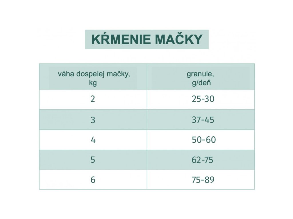 Na kg krmiva: omega-3 mastné kyseliny–5,1 g, omega-6 mastné kyseliny-22,1 g.