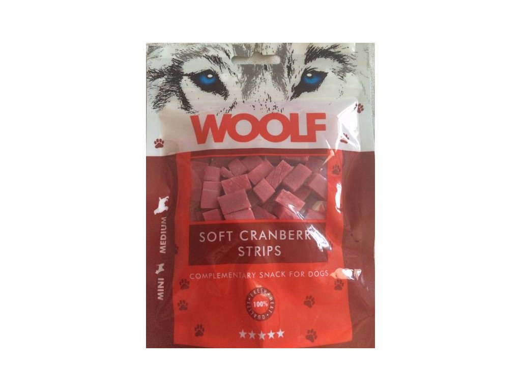 WOOLF pochúťka pre psov: brusnicové mäkké prúžky - 100g