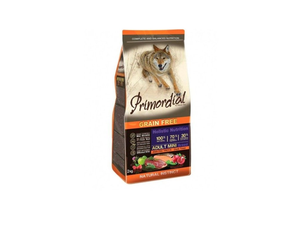 Primordial GF Adult Mini - pstruh s kačicou je kompletné bezobilné krmivo bohaté na proteíny vysokej biologickej hodnoty a obsahuje vhodnú kompozíciu aminokyselín. Kačacie mäso, striktne z voľného výbehu, poskytuje kompletné bielkoviny a atraktívnu chuť, ktorú psy milujú. Pstruh, ryba žijúca len v čistých a čírych vodách, poskytuje ľahko stráviteľné bielkoviny a ako všetky ryby, je bohatý na omega 3 mastné kyseliny, ktoré vykonávajú dôležitú kozmetickú funkciu na koži a srsti a sú veľmi prospešné pre kardiovaskulárny systém (srdce a cievy) . Ovocie a zelenina bohaté na vitamíny, minerály a fytonutrienty, tráviace vlastnosti ananásu, antioxidačné funkcie granátového jablka a šípok a podpora pečene zo strany pestreca dodávajú tomuto krmivu dokonalú rovnováhu chuti a živín.