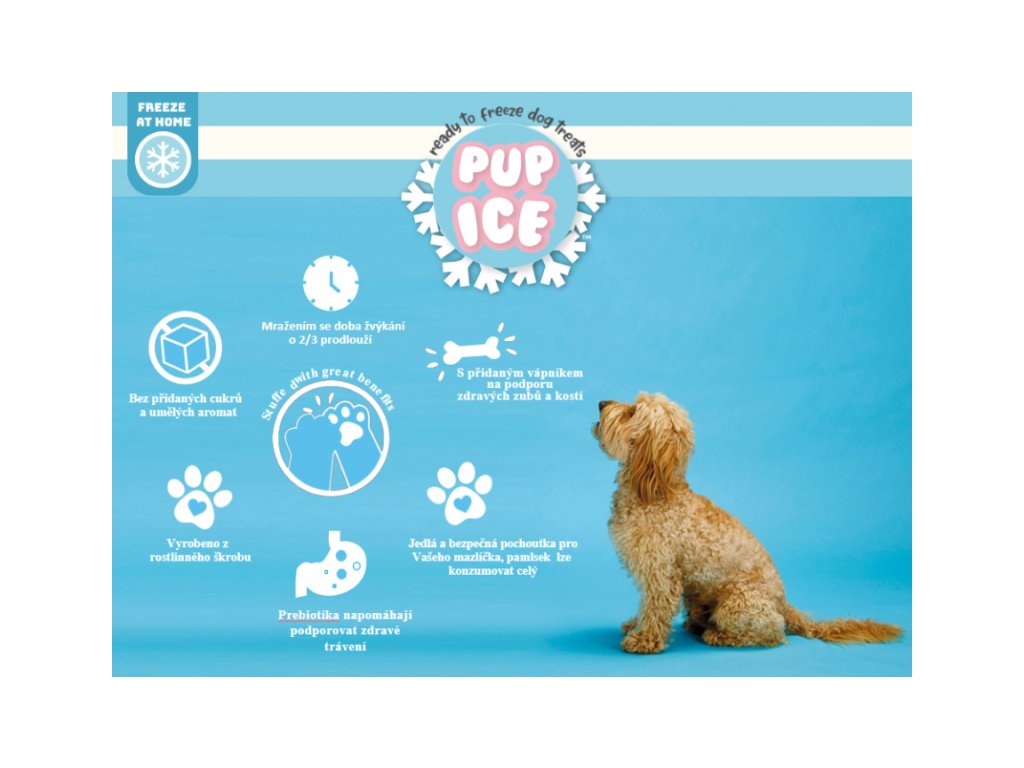 Jedinečná chladiaca pochúťka pre psov, ktorú si váš pes zamiluje a ktorá sa navyše neroztápa. Táto maškrtka nie je len obyčajná dobrota. Chladiaca pochúťka poskytuje spôsobok ako zaistiť osvieženie pre vášho psíka počas horúcich letných dní. Samozrejme ju ale môžete podávať kedykoľvek, nie len v lete. Chutiť totiž bude celoročne. Chladiaca pochúťka PUP ICE sa vyrába vo viacerých tvaroch a príchutiach a je bez pridaného cukru, farbív a aróm. Obsahuje len rastlinný škrob, kuracie, zeleninu, ovocie, probiotiká a ďalšie látky prospešné pre psov. To z nej robí vysokostráviteľnú pochúťku.