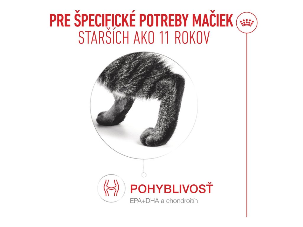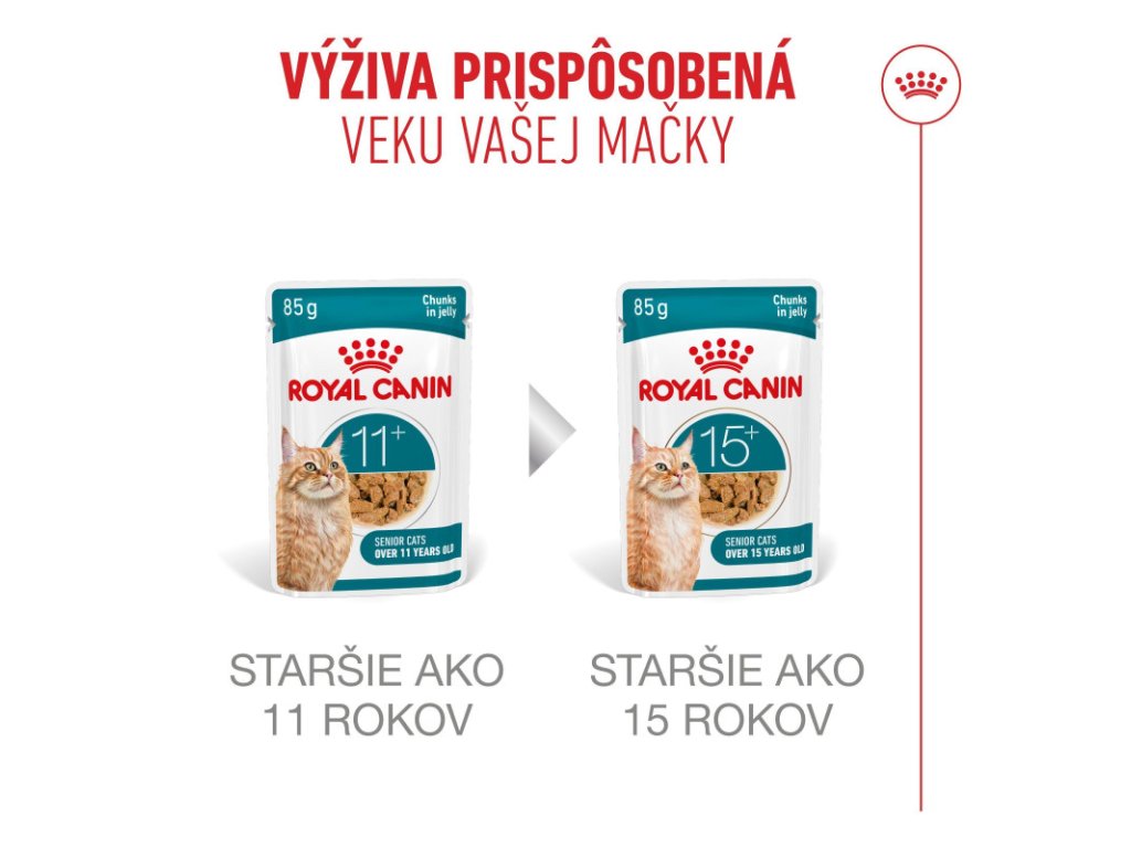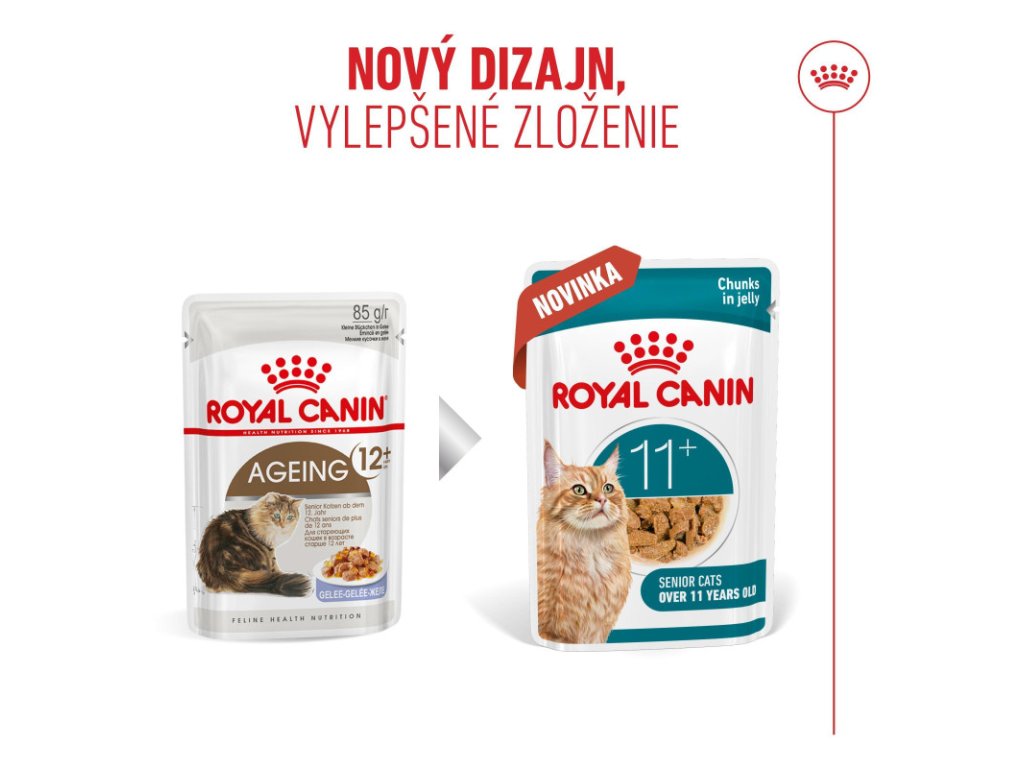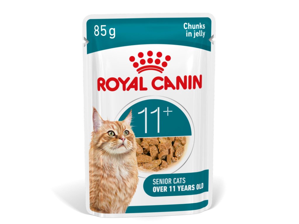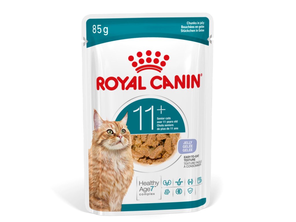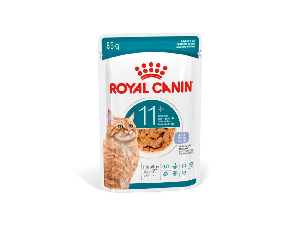 ROYAL CANIN® Ageing 11+ Chunks in Jelly, navrhnuté pre staršie mačky, sa vyznačuje ľahko stráviteľnou textúrou, ktorá vašej mačke poskytne príjemný zážitok z jedla. Zloženie s naším komplexom HealthyAge7™ poskytuje presnú nutričnú zmes navrhnutú tak, aby pomohla udržať sedem kľúčových aspektov zdravia a vitality u mačiek starších ako 11 rokov.