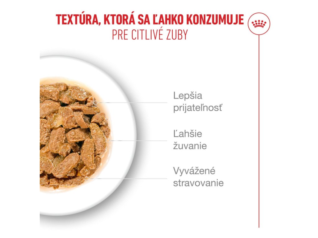 Royal canin AGEING 11+ jelly je mokré krmivo vhodné pre mačky od 11 rokov. Má žuvaciu konzistenciu, ktorá mačke poskytuje príjemný zážitok z jedla.