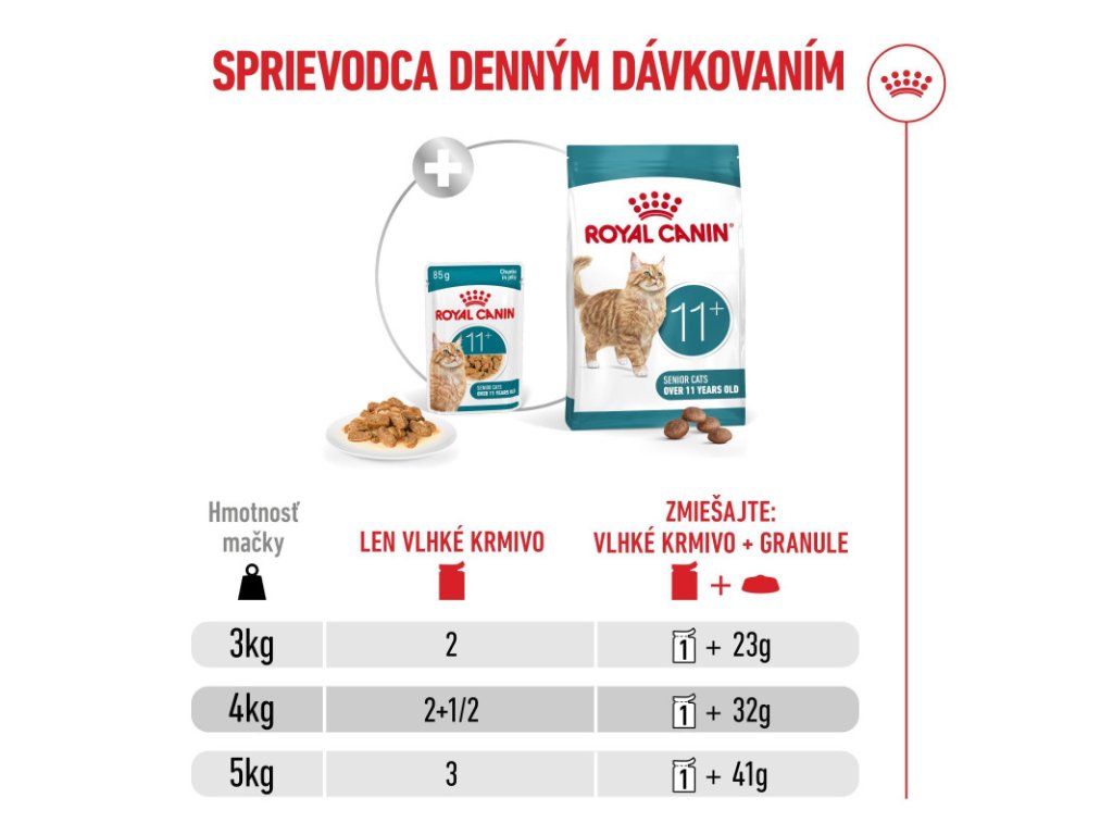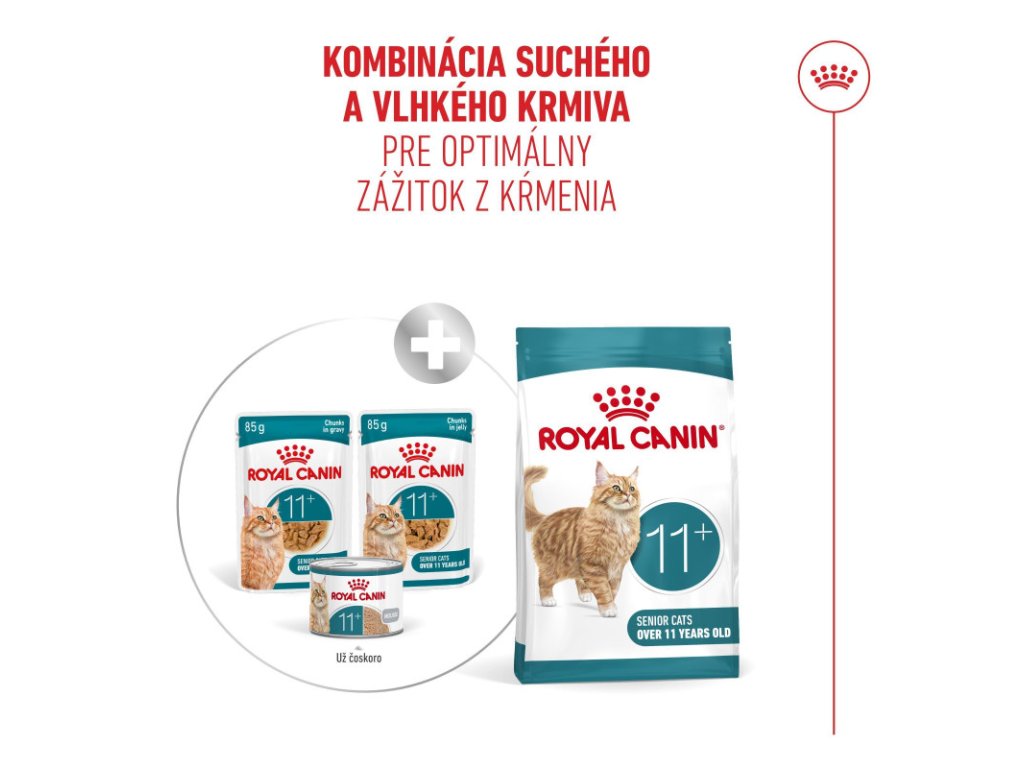 Kombinované kŕmenie pre staršie mačky ROYAL CANIN® Ageing 11+ je k dispozícii v rôznych textúrach, vrátane kúskov v omáčke, mäkkej peny a ako suché granule. Tieto kombinácie môžu zvýšiť pôžitok z jedla a spestriť jedálniček vašej mačky, vďaka čomu sú ideálne pre vyvážené kombinované kŕmenie.