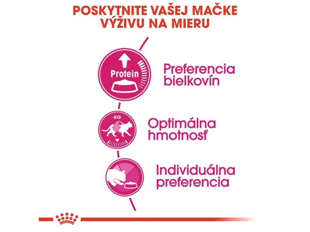 Niektoré mačky môžu odmietať jesť jedlo, ktoré im dáte. Toto správanie je u mačiek bežné, nie však nemenné a je ho možné napraviť výberom krmiva, ktoré obsahuje nielen zdravé živiny, ale tiež apeluje na apetít vašej mačky. Každá mačka má pri výbere potravy prirodzenú preferenciu: aromatický profil, rozmanitosť chutí alebo špecifickú hladinu bielkovín. Vzhľadom na túto skutočnosť vyvinul Royal Canin tri rôzne receptúry, ktoré uspokoja aj tie najvyberavejšie mačky.