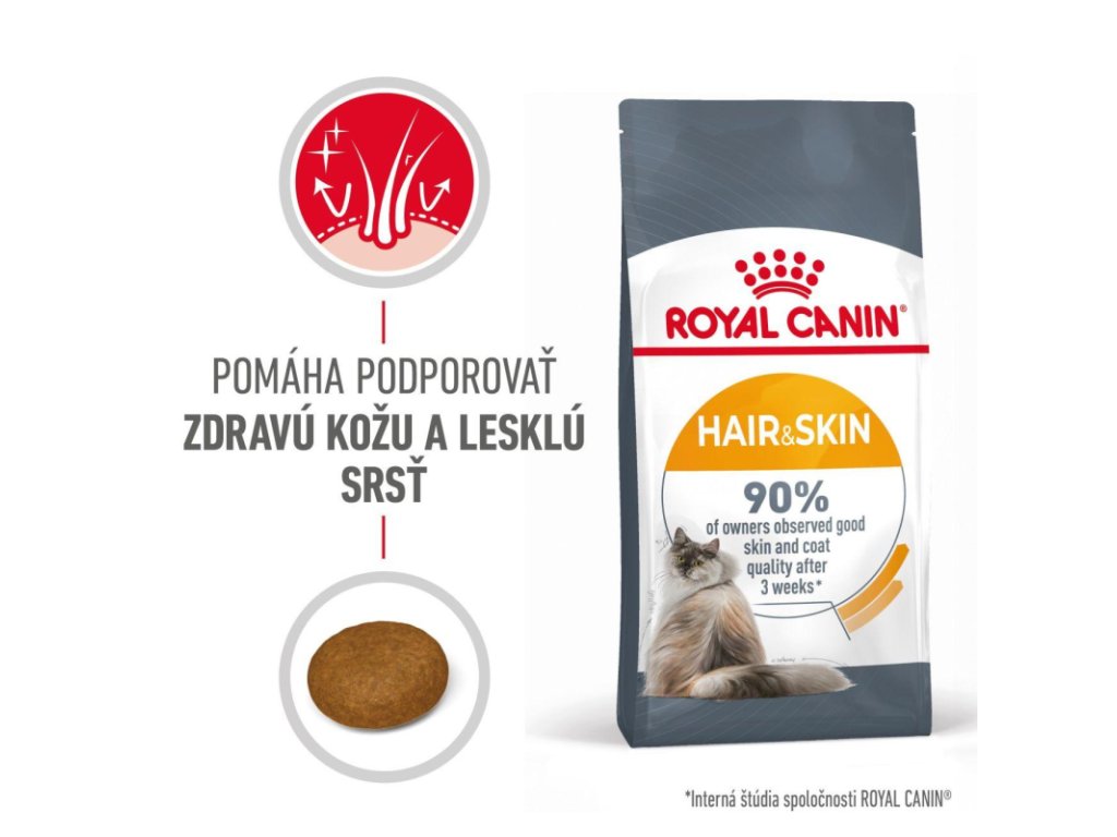 Granule Royal Canin Hair & Skin care je špeciálne vyvážené krmivo, ktoré pomáha udržiavať zdravie kože a srsti. Obsahuje exkluzívny komplex výživných látok, ktoré pomáhajú posilňovať úlohu kože ako bariéry. Vysoko kvalitné bielkoviny so špecifickými aminokyselinami pomáhajú podporovať zdravý rast srsti a obnovu kože. Omega 3 a Omega 6 mastné kyseliny majú tiež priaznivé účinky na zdravie kože a stav srsti.