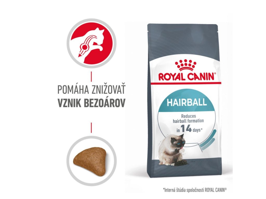 Granule Royal Canin Hairball 34 je špeciálne vyvážené krmivo, ktoré prirodzene pomáha znižovať tvorbu trichobezoárov. Exkluzívny komplex Hairball care je zložený zo špecifickej zmesi vlákniny, vrátane psyllia a nerozpustnej vlákniny, ktoré prirodzene stimulujú intestinálny prechod. V dôsledku toho sa prehltnutá srsť môže vylúčiť v stolici skôr, než by sa hromadila v žalúdku alebo ju mačka vyvrátila.