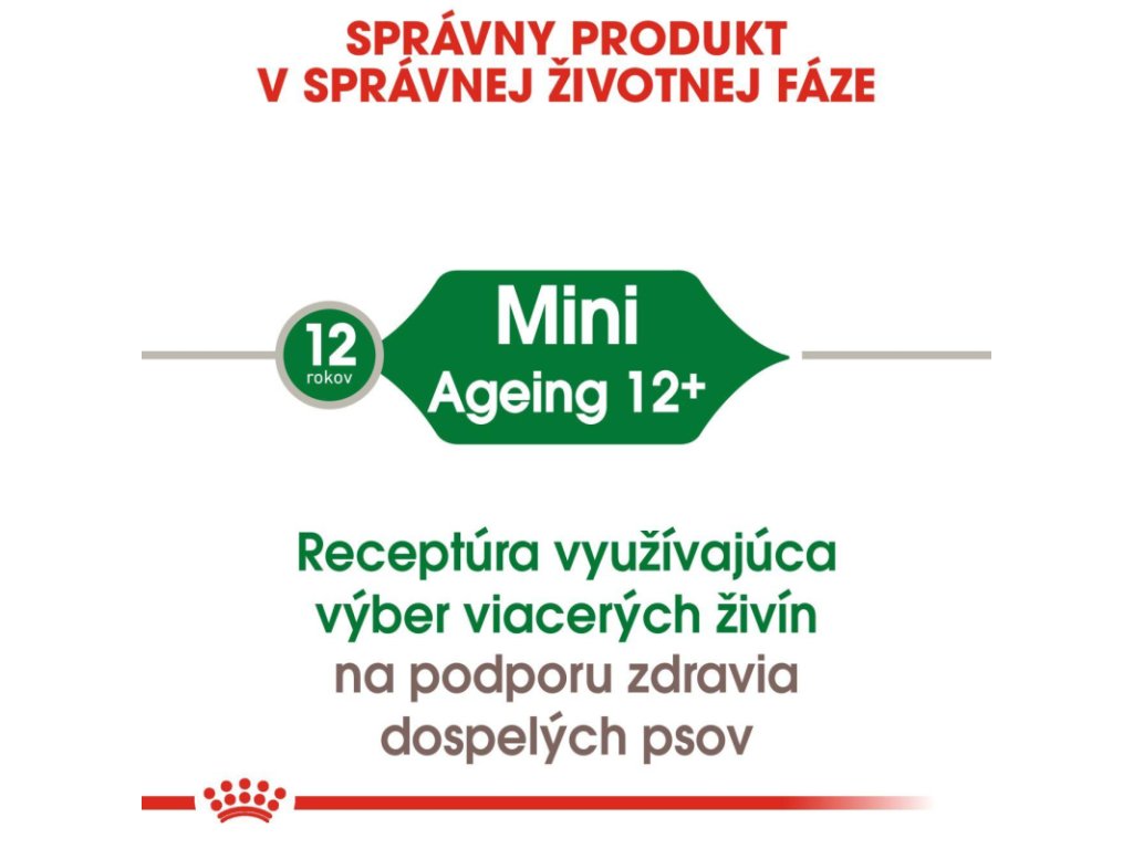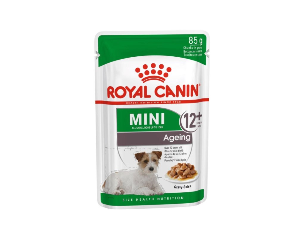 ROYAL CANIN® Mini Aging 12+ v omáčke, vhodný pre malé psy staršie ako 12 rokov s hmotnosťou do 10 kg, je špeciálne vytvorený s ohľadom na všetky nutričné potreby vášho mini psa. ROYAL CANIN® Mini Aging 12+ v omáčke obsahuje exkluzívny komplex antioxidantov. Táto receptúra antioxidantov pomáha neutralizovať účinky voľných radikálov. Vďaka starostlivo prispôsobenej hladine fosforu pomáha ROYAL CANIN® Mini Ageing 12+ in Gravy taktiež pomáha podporovať obličkový systém vášho psa. Zahrnutie Omega-3 mastných kyselín EPA a DHA tiež pomáha podporovať a udržiavať zdravú, dobre vyživenú kožu a dobrý stav srsti vášho psa.