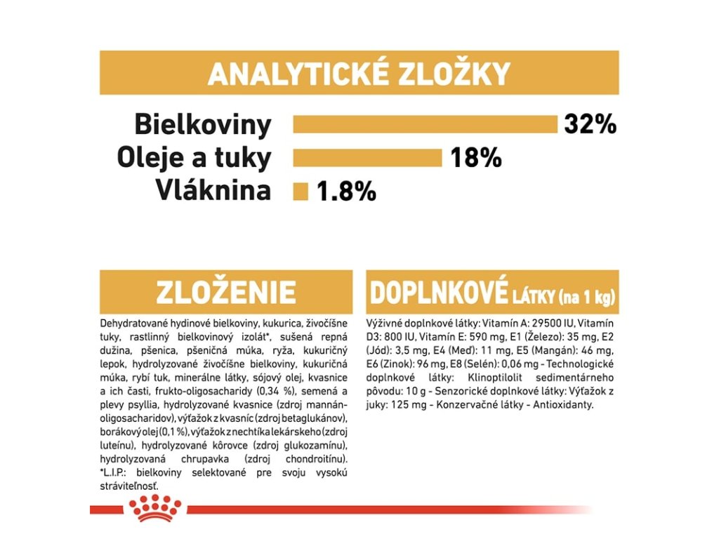 Zloženie: dehydratované hydinové bielkoviny, kukurica, živočíšne tuky, rastlinný bielkovinový izolát*, sušená repná dužina, pšenica, pšeničná múka, ryža, kukuričný lepok, hydrolyzované živočíšne bielkoviny, kukuričná múka, rybí tuk, minerálne látky, sójový olej, kvasnice a ich časti, frukto-oligosacharidy (0,34 %), semená a plevy psyllia, hydrolyzované kvasnice (zdroj mannán-oligosacharidov), výťažok z kvasníc (zdroj betaglukánov), borákový olej (0,1 %), výťažok z nechtíka lekárskeho (zdroj luteínu), hydrolyzované kôrovce (zdroj glukozamínu), hydrolyzovaná chrupavka (zdroj chondroitínu).