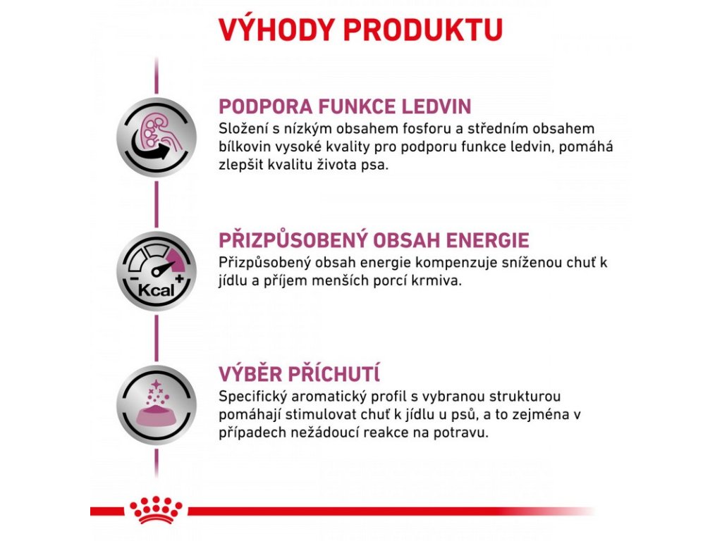 Royal Canin VD Canine Renal Special je diétne šťavnaté krmivo vyvinuté špeciálne pre vyberavých psov trpiacich chronickým ochorením obličiek. Pridané zložky podporujú správnu činnosť obličiek. Receptúra obsahuje komplex antioxidantov, esenciálne mastné kyseliny EPA a DHA a nízky podiel fosforu, ktorý prispieva k detoxikácii obličiek. Alkalizujúci účinok krmiva podporuje správnu látkovú výmenu. Krmivo je veľmi chutné a vyznačuje sa dobrou znášanlivosťou a isto si ho obľúbia i veľmi vyberaví psí jedinci.