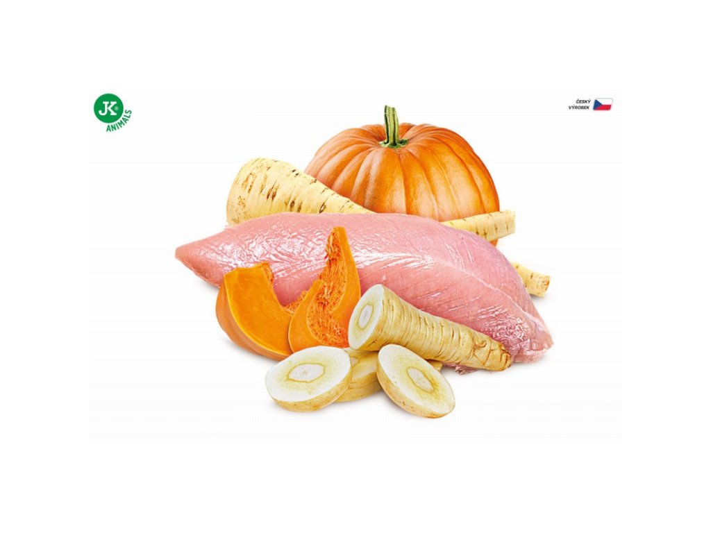 Zloženie: dehydrované morčacie mäso (35 %), hrášok (35 %), sladké zemiaky (14 %), kurací tuk (7 %), tekvica (4 %), sušená jablková dužina (4 %), sušený paštrnák (1 %).