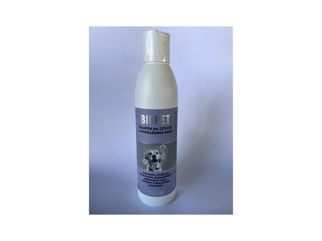 BIOPET šampón na citlivú a podráždenú kožu s lupinami - s ichtamolom, kyselinou salicylovou, esenciálnym olejom z rozmarínu a extraktom z pagaštana konského.
