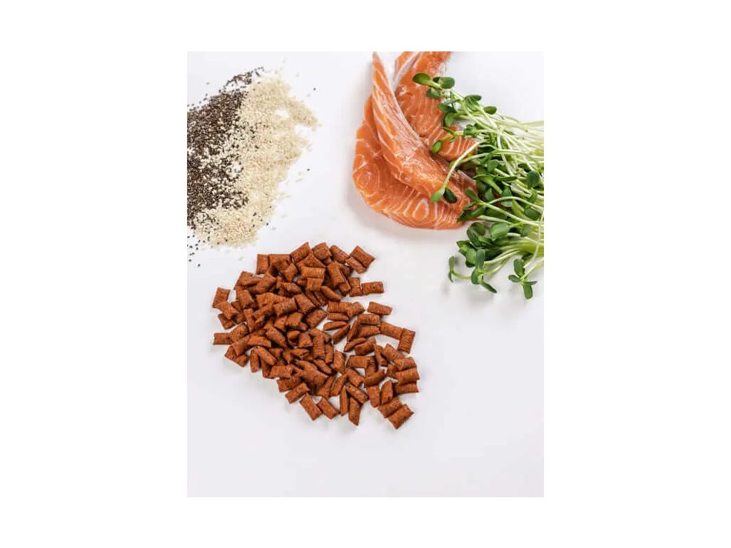 Zloženie: obilniny, mäso a živočíšne produkty, oleje a tuky, rastlinný bielkovinový extrakt, ryby a rybie produkty (4 % losos, prírodný zdroj omega-3 mastných kyselín), minerálne látky.