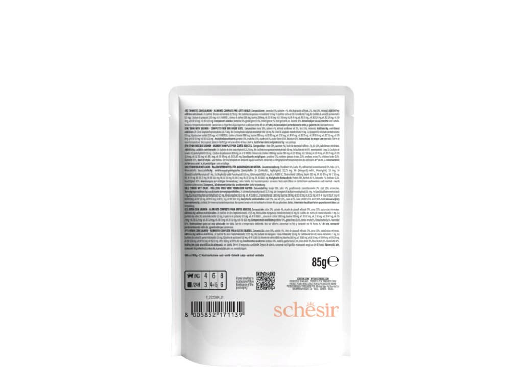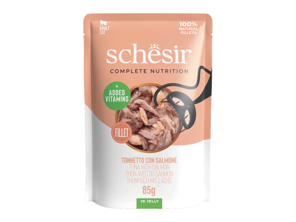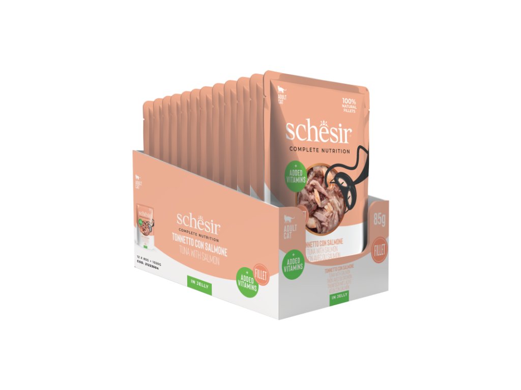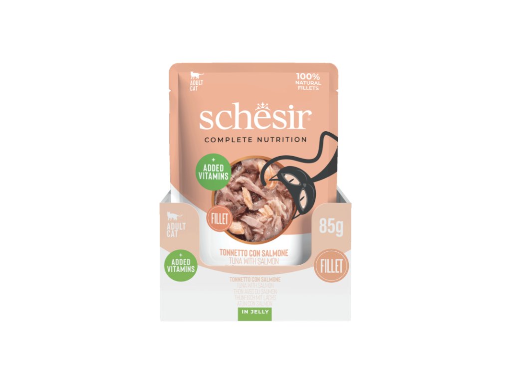 Schesir Cat kapsička - tuniak a losos v želé sú tie najkvalitnejšie kusy filet z tuniaka s lososom v lahodnej želatíne v spojení s balením "Zero Waste" ako...