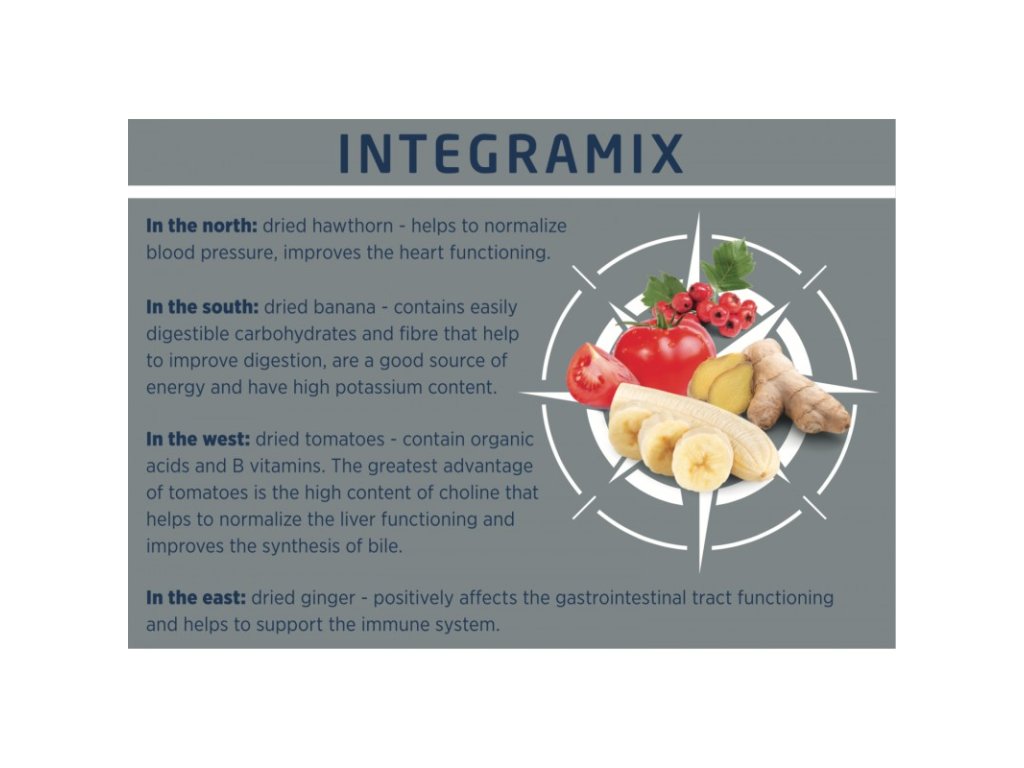 - Vzorec INTEGRAMIX: sušené paradajky, zázvor, hloh a banány - pre celkové zdravie domácich miláčikov a silnú imunitu