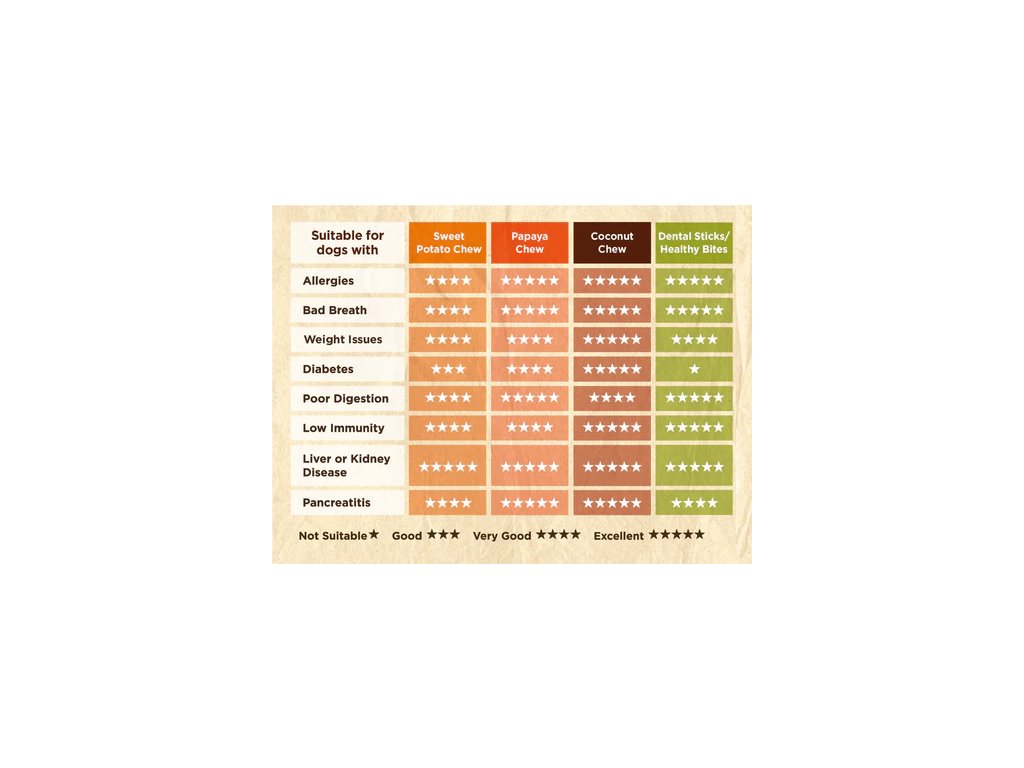 Tieto maškrty sú skvelou alternatívou k bežne dostupným dentálnym pochúťkam, ktoré často obsahujú iba bližšie nešpecifikované rastlinné produkty nízkej kvality a zanedbateľných nutričných hodnôt. Na rozdiel od nich je zloženie Soopa úplne transparentné a výživové hodnoty obsiahnutých zložiek sú pre psa prínosom.