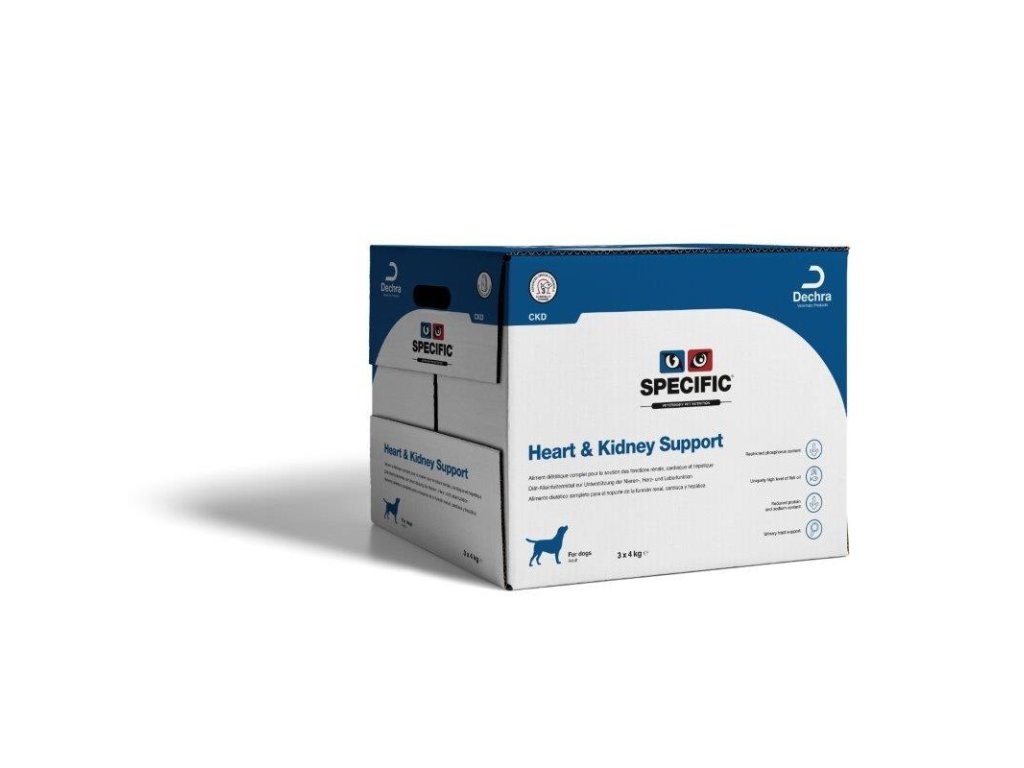 SPECIFIC Heart & Kidney Support je kompletné diétne krmivo na podporu funkcií obličiek, srdca a pečene pri dospelých psoch trpiacich chronickou obličkovou, srdcovou a/alebo pečeňovou nedostatočnosťou. Krmivo má nízky obsah fosforu a sodíku a obmedzený obsah proteínov s vysokou kvalitou a stráviteľnosťou.. Má vysoký obsah esenciálnych mastných kyselín(vrátane omega-3 mastných kyselín z rybieho oleja) a schopnosť okysľovať moč. Toto krmivo pokrýva všetky výživové potreby dospelých psov a prispieva k ich zdraviu.