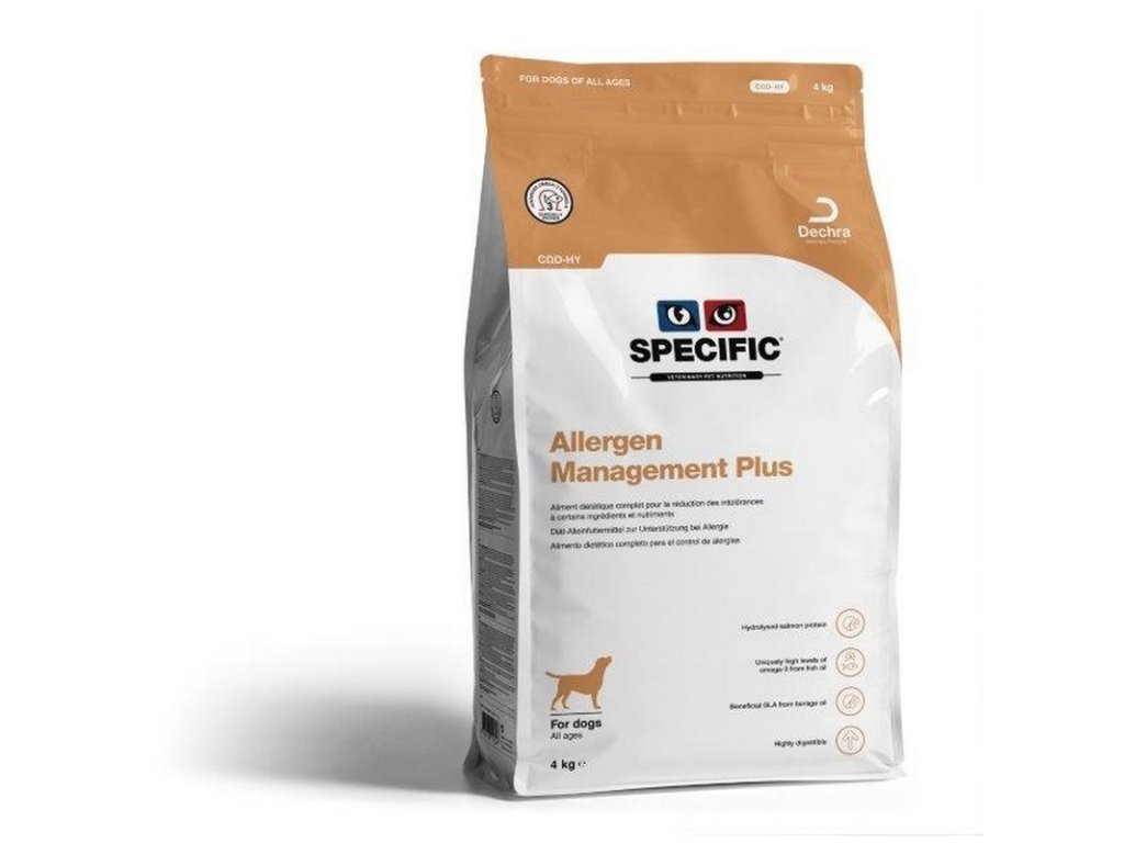 Specific COD - HY Allergy Management Plus podporuje správnu funkciu kože pri dermatóze a nadmernej strate srsti, zmierňuje symptómy potravinovej intolerancie a akútnych porúch črevnej absorpcie a kompenzuje poruchy trávenia. Obsahuje obmedzené množstvo vybraných zdrojov proteínov a uhlohydrátov a je vysoko stráviteľné. Má zvýšené obsah sodíku a draslíku a vysoký obsah esenciálnych mastných kyselín, najmä kys. linolovej a komplexu kyseliny eikozapentaénovej (EPA) a dokozahexaénovej (DHA).