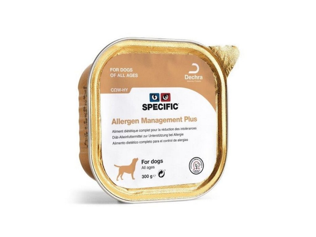 SPECIFIC Allergen Management Plus je kompletné diétne krmivo pre šteňatá a dospelé psy, ktoré podporuje zdravie pokožky pri dermatózach a nadmernom pĺznutí, zmierňuje potravové intolerancie, intolerancie voči prísadám, akútne poruchy črevnej absorpcie a vyrovnáva poruchy trávenia. Krmivo obsahuje vybrané zdroje bielkovín a sacharidov a vysoko stráviteľné prísady. Má zvýšené hladiny sodíka a draslíka, vysoké hladiny esenciálnych mastných kyselín a nenasýtených mastných kyselín EPA a DHA.