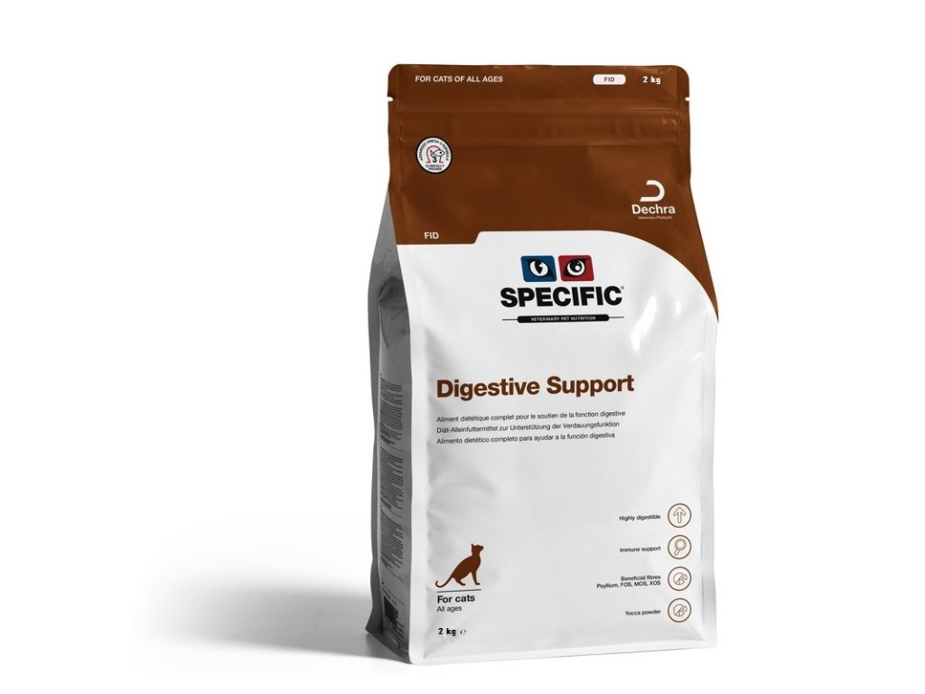 SPECIFIC Digestive Support je kompletné diétne krmivo pre mačky, ktoré zmierňuje (akútne) poruchy absorpcie čriev a vyrovnáva poruchy trávenia a/alebo exokrinnú pankreatickú insuficienciu (nedostatočnosť podžalúdkovej žľazy). Je vysoko stráviteľné a má zvyšený obsah sodíka a draslíka. Toto krmivo pokrýva všetky výživové potreby mačiek a prispieva k ich zdraviu.