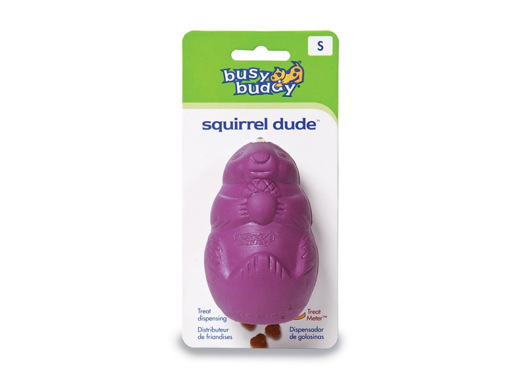 Veverička Dude je extrémne odolná na hryzenie. Na spodnej strane má hračka otvor a gumové hroty, ktoré sa dajú nastaviť-zrezať alebo odstrihnúť na veľkosť podľa toho aké odmeny používate. Odmeny potom postupne vypadávajú ako sa psík s hračkou hrá. Vyrobené z prírodného kaučuku.