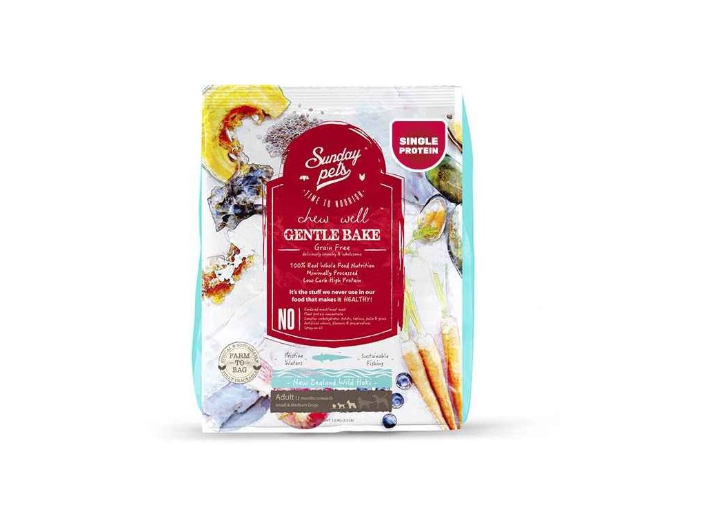 SUNDAY PETS GENTLE BAKE GRAIN WILD HOKI je kompletné šetrne pečené krmivo vhodné pre dospelé psy malých a stredných plemien od 1roku veku. Obsahuje voľne žijúceho Hoki z Nového Zélandu. Krmivo bez obilnín, bohaté na proteíny a s nízkym obsahom sacharidov. Unikátny tvar CHEW WELL prispieva k pomalšiemu kŕmeniu a tým zlepšuje trávenie.