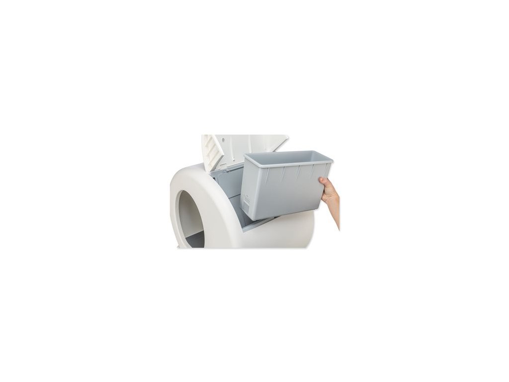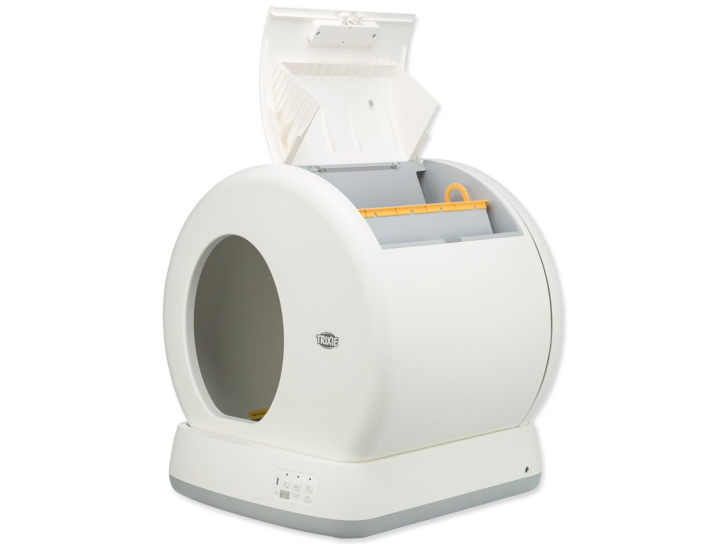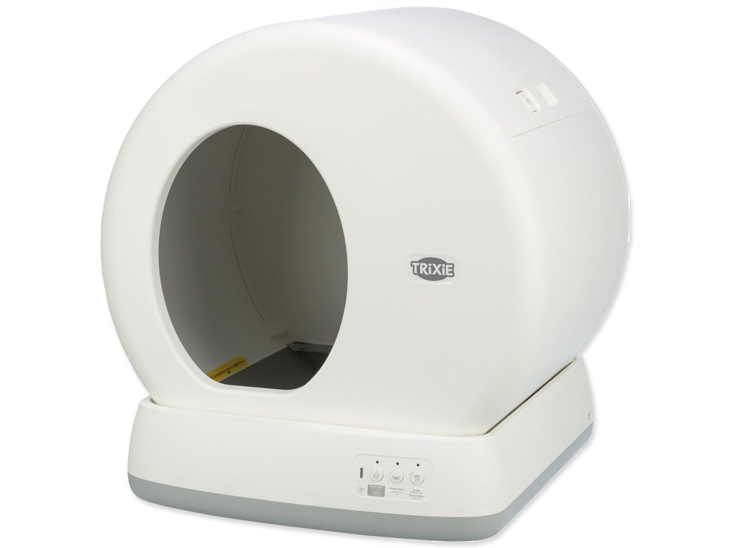 Automatická toaleta Trixie v bielej farbe, vybavená systémom, ktorý po každom použití otáča bubon a oddeľuje nečistoty od čistého steliva. Vďaka tomu je toaleta neustále čistá a pripravená na ďalšie použitie.