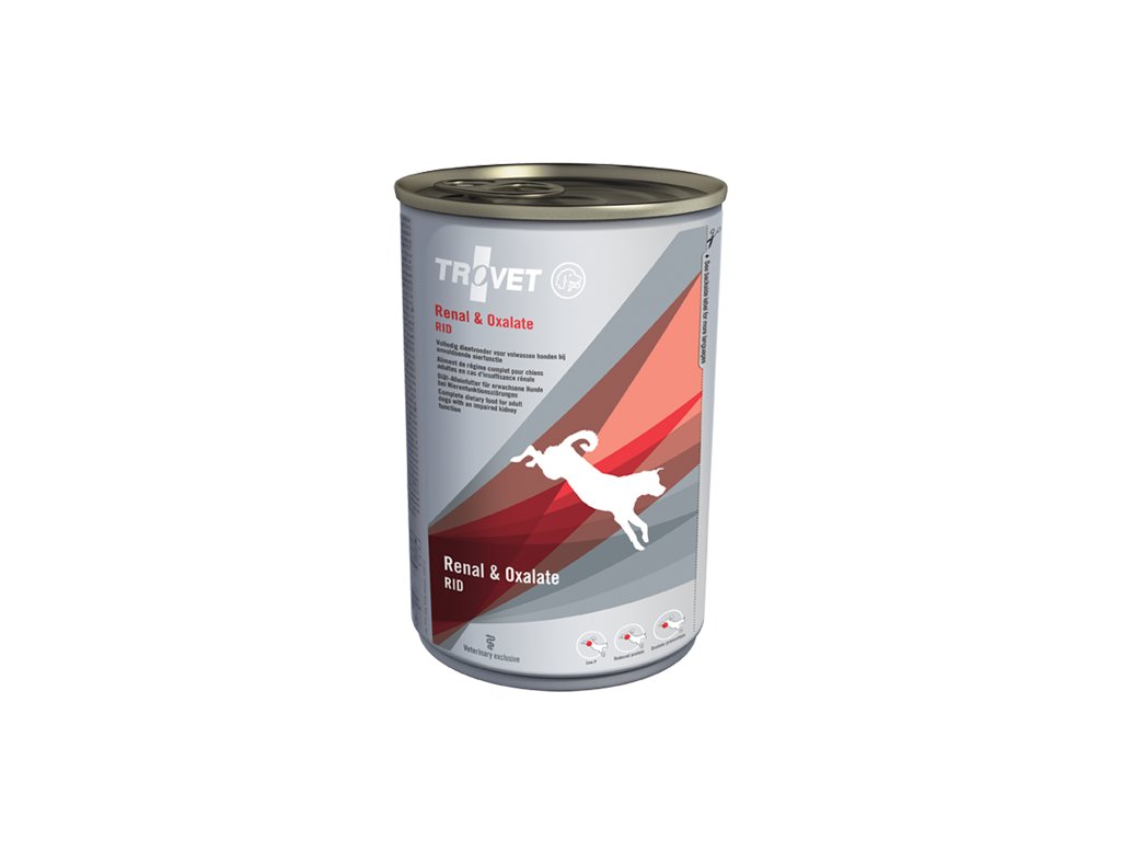 Krmivo Trovet RID Renal & Oxalate je špeciálne vyvinuté tak, aby vyhovovalo požiadavkám psov s chronickým zlyhaním obličiek. Strava je obmedzená na bielkoviny a fosfor, čím zabraňuje hromadeniu odpadu, znižuje tlak na obličky a v konečnom dôsledku spomaľuje progresiu zlyhania obličiek. Použité proteíny sú vysokej kvality, aby vyhovovali požiadavkám na aminokyseliny, bez toho, aby dochádzalo k prebytočným odpadovým produktom. Energetická hodnota krmiva znižuje objem potravy a pomáha zvieratám so stratou chuti do jedla zabezpečiť ich dennú potrebu energie. Krmivo je taktiež určené na zníženie tvorby šťavelanu vápenatého. Cielené použitie citrátu draselného má vplyv na zvýšenie pH moču, čo znižuje vylučovanie vápnika močom. Okrem toho je citrát schopný viazať vápnik, čo môže znížiť výskyt tvorby oxalátu vápenatého v moči. Obsahuje tiež veľa vitamínu B6, čím bráni tvorbe oxalátov spôsobených nedostatkom vitamínu B6.