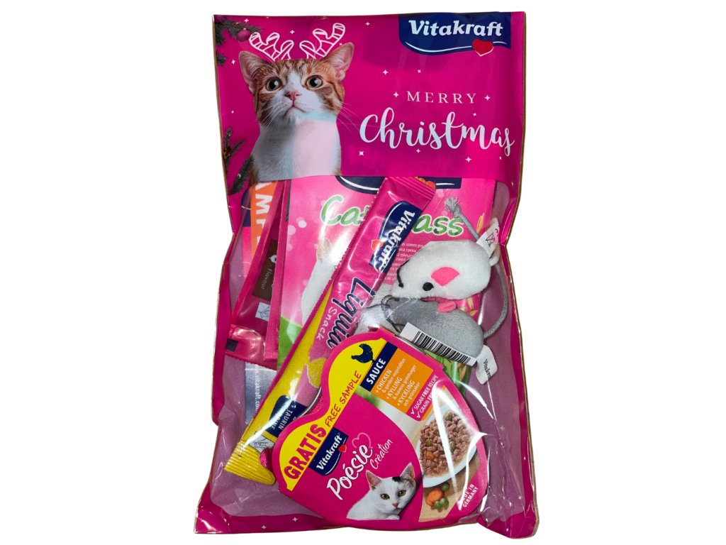 Všetky produkty sú zabalené v plastovom vrecúšku, ktorý obsahuje vianočnú zelenú potlač s obrysom mačičky a nápisom v angličtine - Veselé Vianoce.