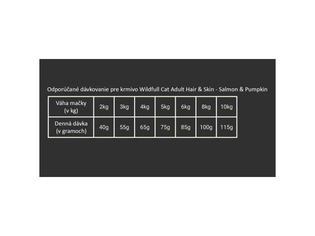 POKYNY: podávajte v suchej forme. Odporúčame kŕmiť Vašu mačku podľa tabuľky dávkovania na základe jej aktuálnej váhy. Tabuľka s odporúčanou dennou dávkou je len orientačná. Denná dávka krmiva závisí od veku a váhy Vašej mačky, jej aktivity ako aj ročného obdobia. V prípade, že má Vaša mačka nadváhu, odporúčame zredukovať dennú dávku o 10%. V prípade ak je Vaša mačka podvyživená, odporúčame zvýšiť dennú dávku o 10%. Zabezpečte neustály prístup k čistej pitnej vode. Krmivo skladujte na suchom mieste mimo slnečného žiarenia.