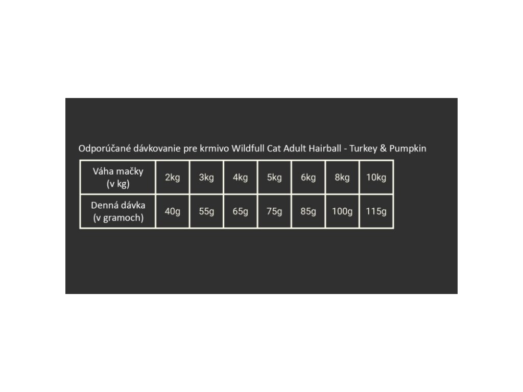 POKYNY: podávajte v suchej forme. Odporúčame kŕmiť Vašu mačku podľa tabuľky dávkovania na základe jej aktuálnej váhy. Tabuľka s odporúčanou dennou dávkou je len orientačná. Denná dávka krmiva závisí od veku a váhy Vašej mačky, jej aktivity ako aj ročného obdobia. V prípade, že má Vaša mačka nadváhu, odporúčame zredukovať dennú dávku o 10%. V prípade ak je Vaša mačka podvyživená, odporúčame zvýšiť dennú dávku o 10%. Zabezpečte neustály prístup k čistej pitnej vode. Krmivo skladujte na suchom mieste mimo slnečného žiarenia.
