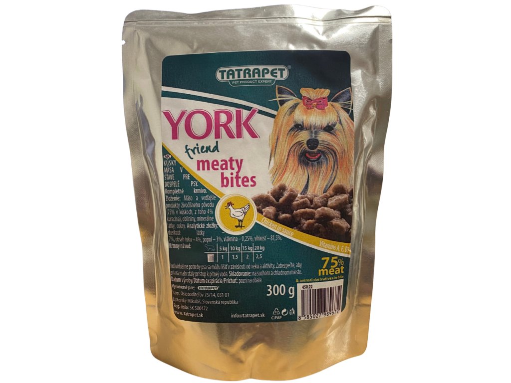 Kapsička YORK Friend je kompletné krmivo pre dospelé psy. Balenie obsahuje kúsky mäsa v štave.